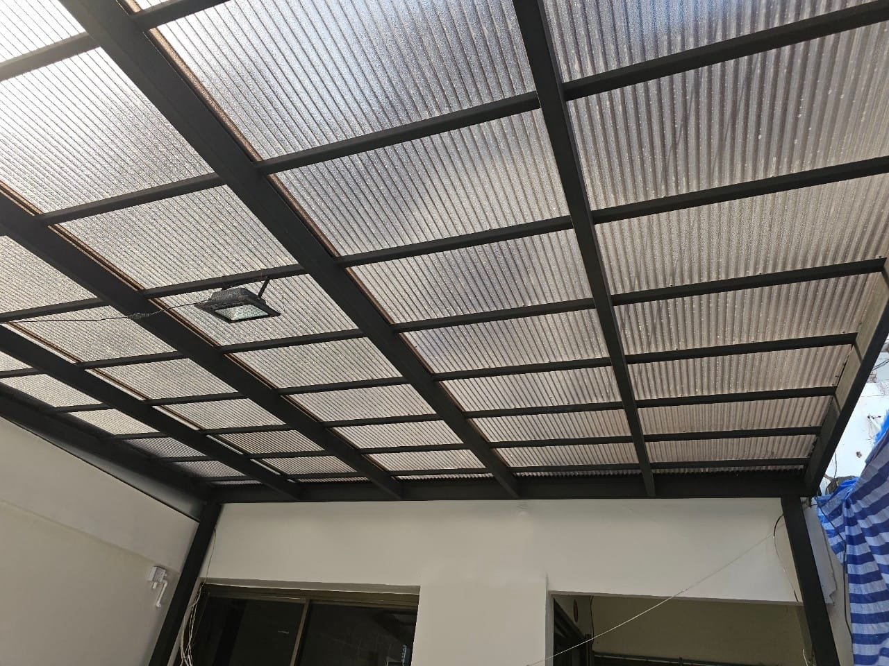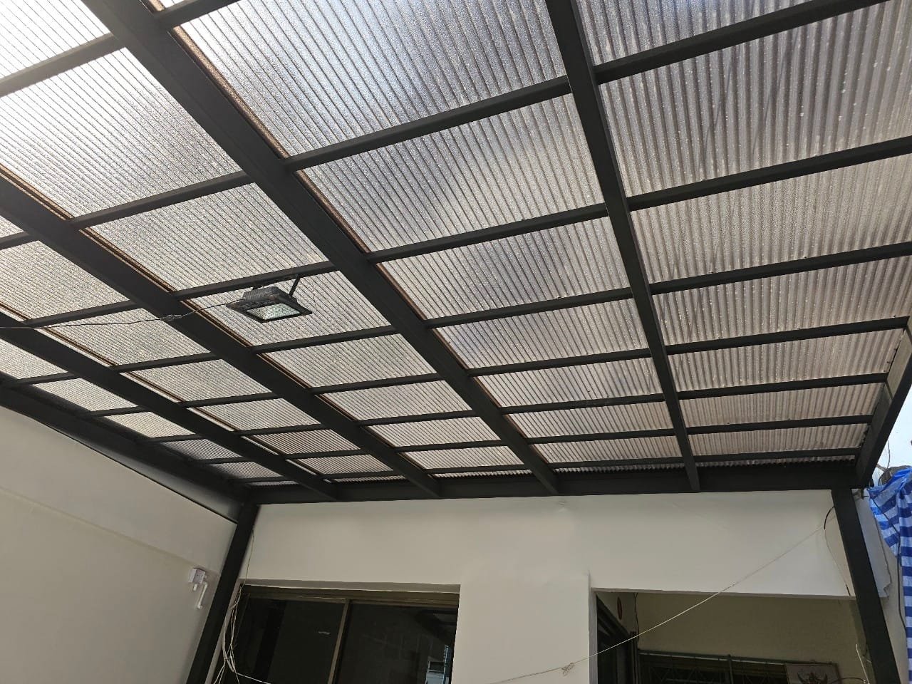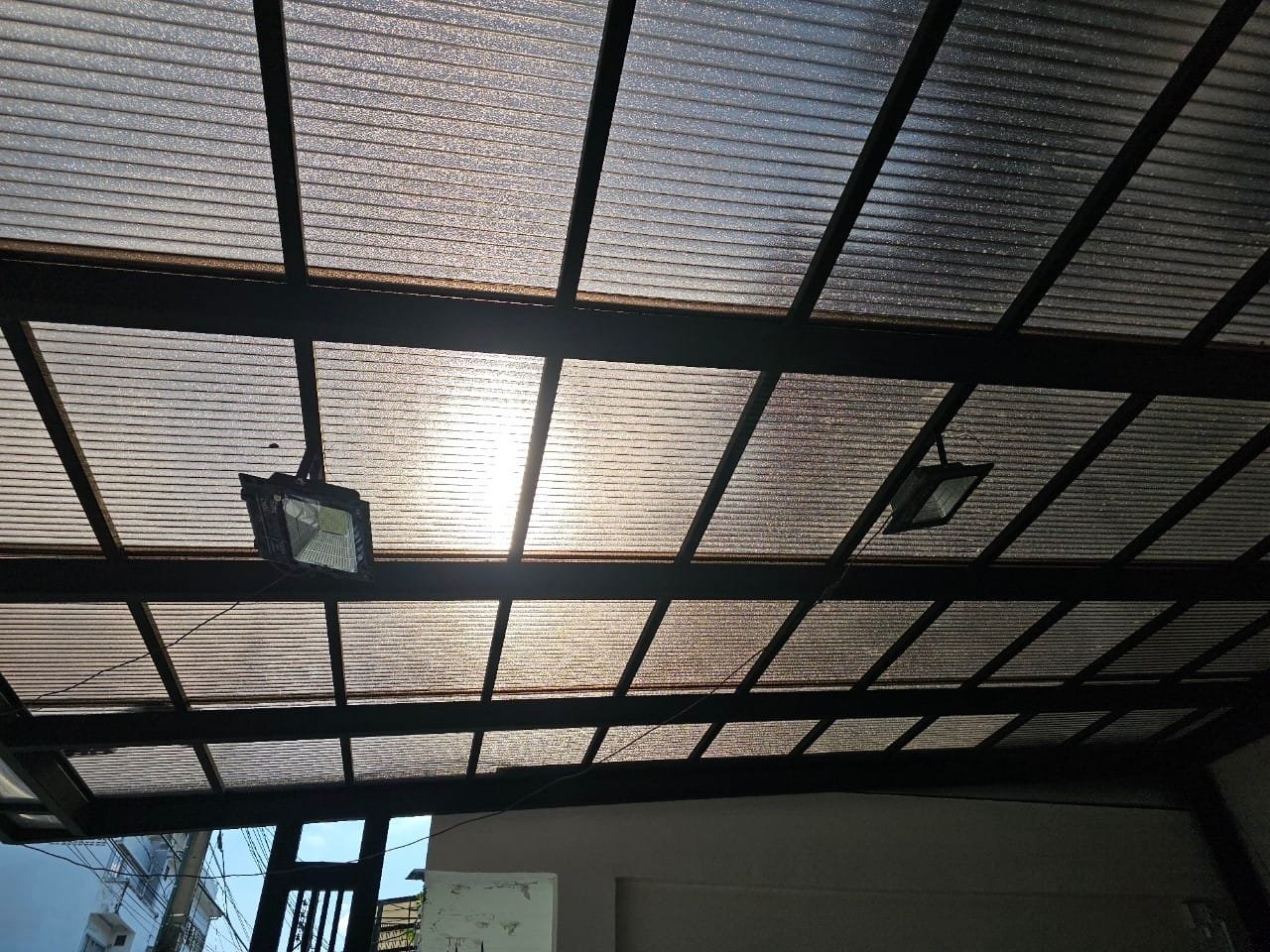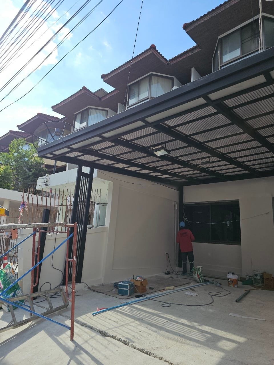 งานต่อเติมหลังคาที่จอดรถบ้านทาวน์โฮม โครงสร้างเหล็ก วัสดุหลังคาโพลีคาร์บอเนตแข็งแรงทนทาน