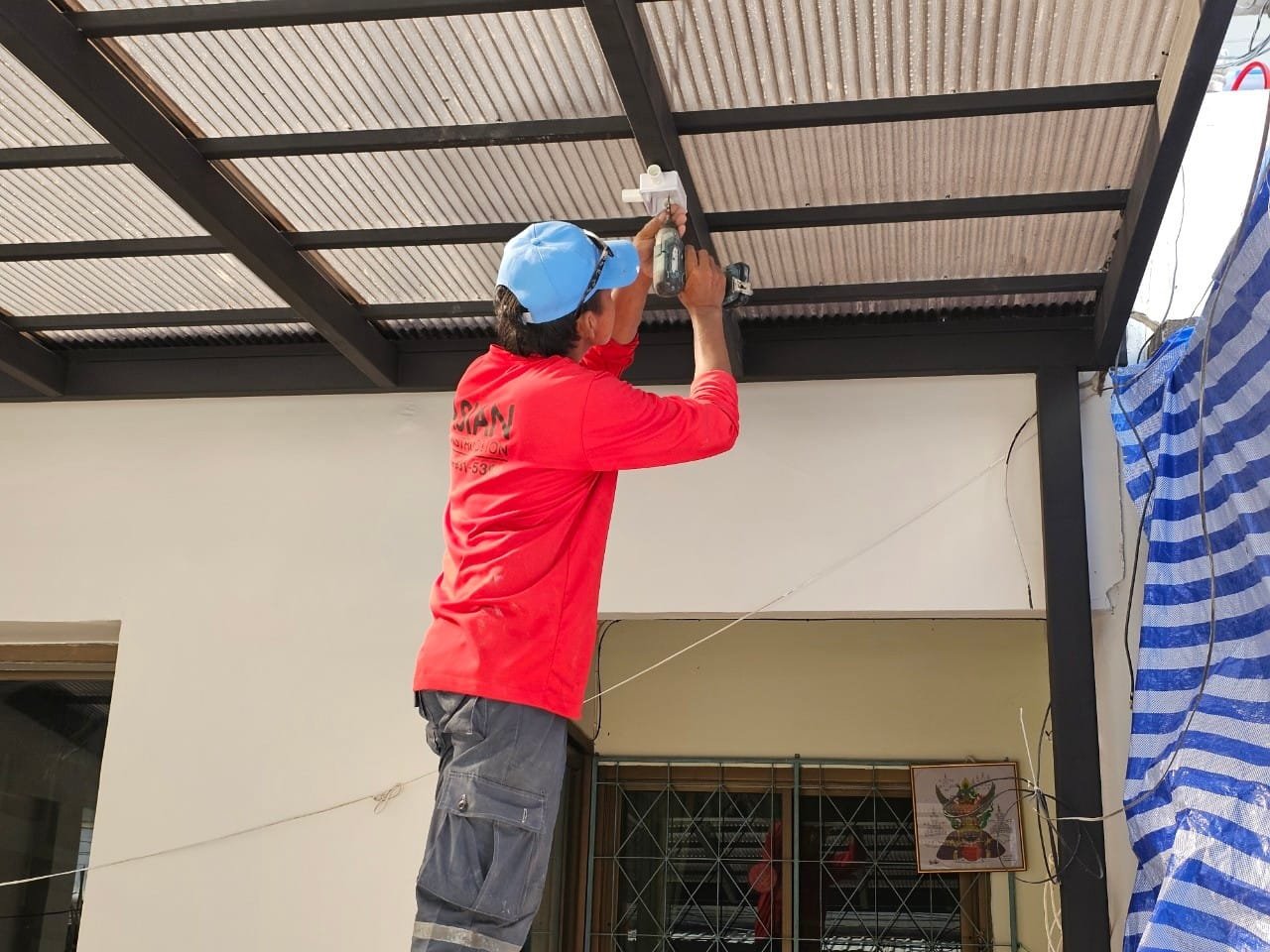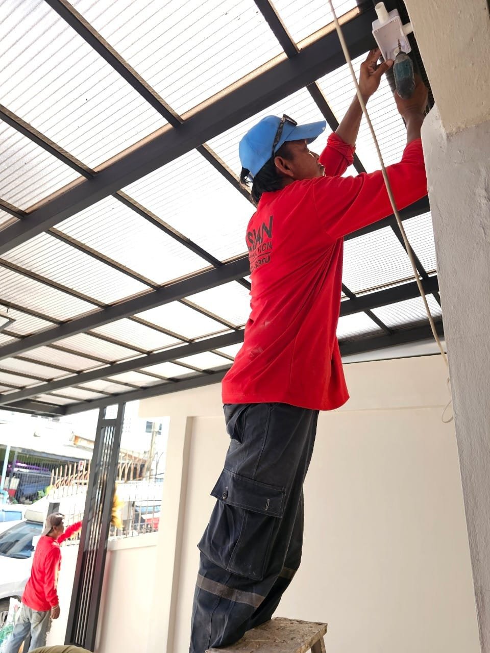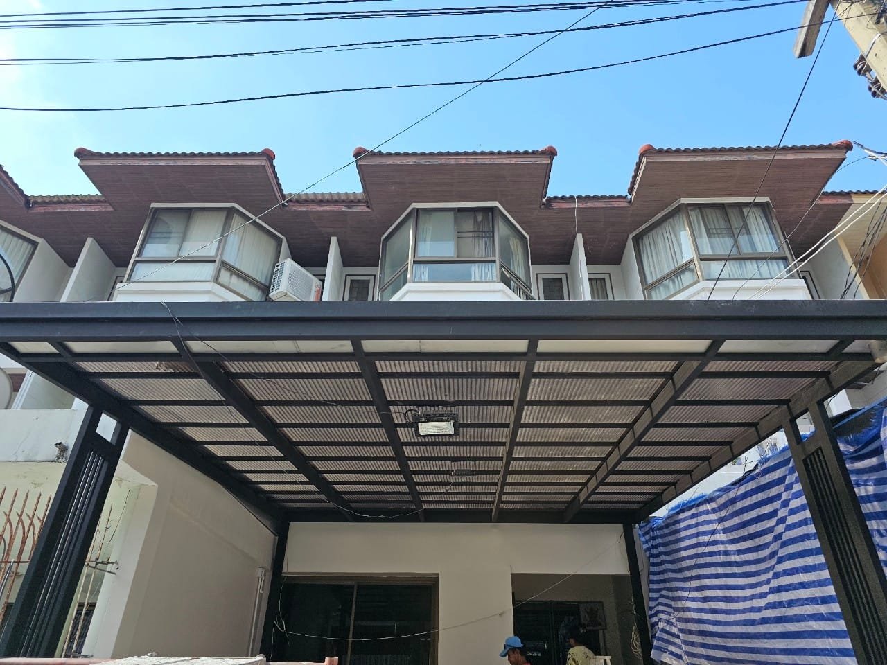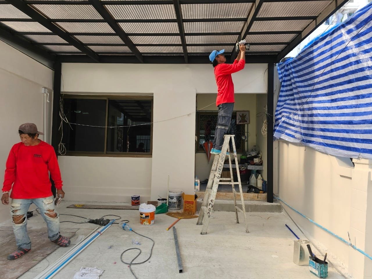 งานต่อเติมหลังคาที่จอดรถบ้านทาวน์โฮม โครงสร้างเหล็ก วัสดุหลังคาโพลีคาร์บอเนตแข็งแรงทนทาน